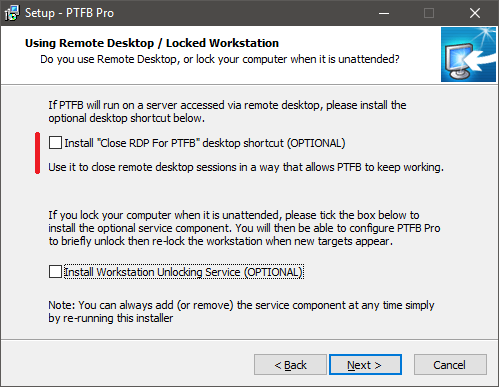 In reality, what’s happening here is that when the remote desktop window is minimize or closed, the remote Windows machine becomes unresponsive to all PTFB’s attempts to press buttons and keys. PTFB still tries to carry out its appointed tasks, but its efforts are ignored by the remote OS. Happily, there are ways round this.